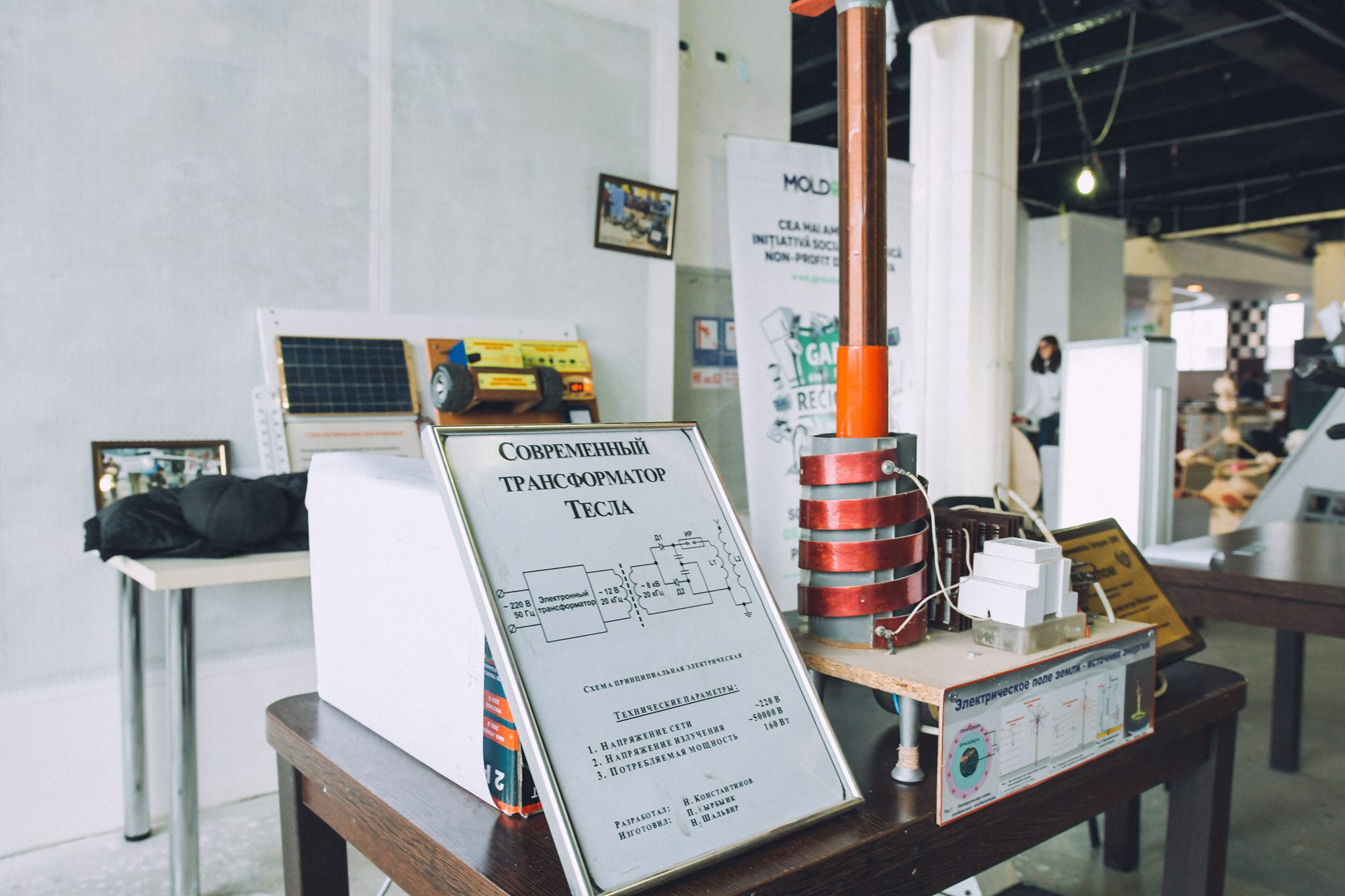 На ярмарке мы выставили на обозрение посетителей “Электросамокат, заряжаемый от энергии солнца”, вечно притягивающий к себе внимание “Трансформатор Тесла”, и социально значимый экспонат “Электрифицированная инвалидная коляска”.